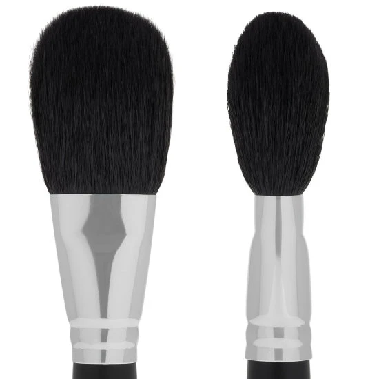 This makeup brush is made from goat hair. It is one of the smaller dense fluffy flat brushes in the line. Perfect as a powder brush or a cheek brush.