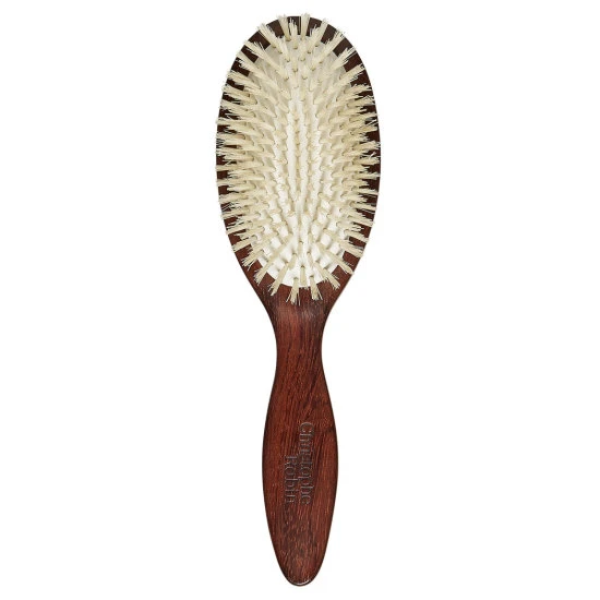 A hairbrush made with 100 percent natural boar bristles and wood to easily detangle. Regular brushing is necessary for stimulating blood circulation, which generates hair growth, oxygenates the scalp, and eliminates impurities. Brushing from root to tip distributes natural oils, protecting the hair fiber against harmful external factors while brushing just a few times daily will strengthen the hair, make it supple, and add shine.