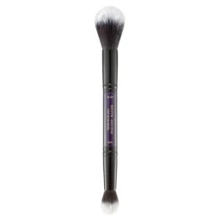 - The “Blush” end has a large, round, domed brush head to pick up and apply product effortlessly over the face, on the cheekbones, and temples