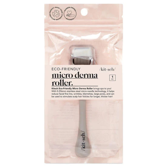 Kitsch eco-friendly micro derma roller being spa to you! With 0.256mm stainless steel mirco-needle technology, it helps reduce facial fine lines, wrinkles, blemishes, large pores and can be used to stimulate scalp hair folicles for longer, thicker hair!