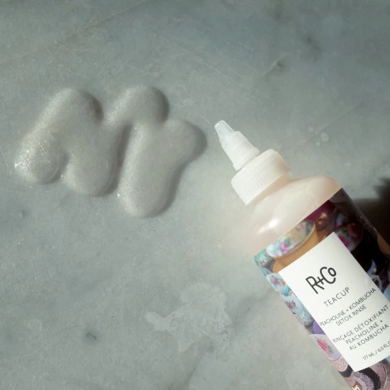 Detox your locks with R+Co Teacup Peacholine + Kombucha Detox Rinse. This light conditioning rinse removes harsh metals and pollutants from your hairu2014all while helping to prevent color fade-out and nourishing dry strands. The result? Smooth, sealed, and protected strands.