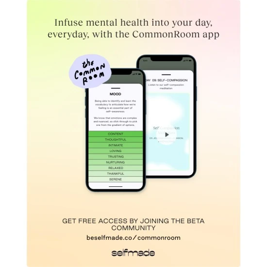 With SELFMADE’s CommonRoom app, you’ll be able to infuse mental health into your day, everyday, with programming, content, and resources created with their mental health experts. Access is completely free for all and by signing up for their Beta Community, you’ll be able to test drive new features first and play a key role in shaping how their experience evolves.